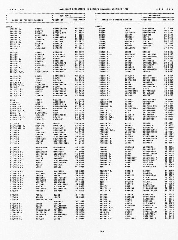 Wedding Register Stephen John JONES and Gail Denise BEMBRIDGE (JONES) : Registered at Walsall During 3 December 1982 : Volume 34 : Page 282