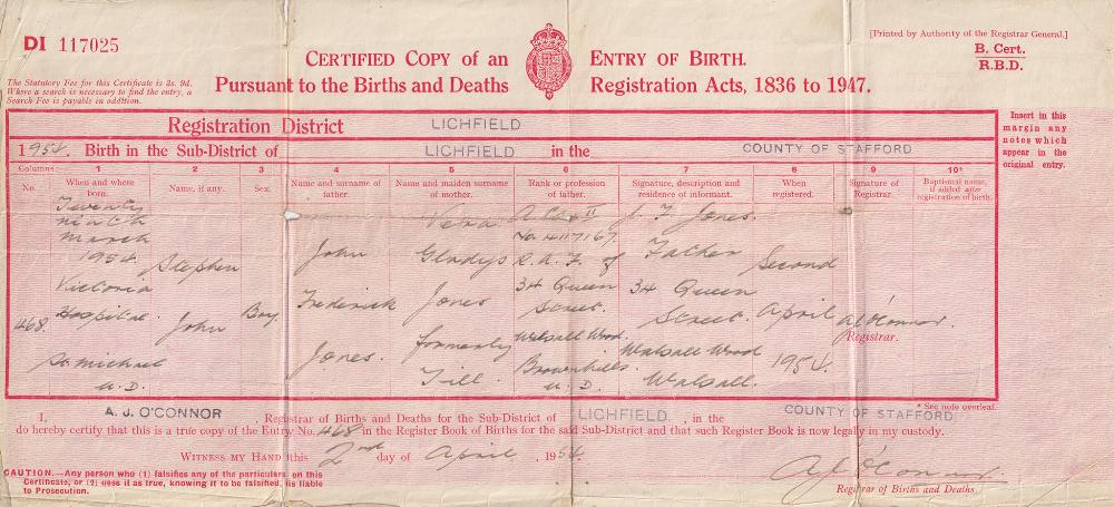 Birth Certificate Stephen John JONES Was Born on 29 March 1954 in Lichfield, Staffordshire Registered on 2 April 1954 in Lichfield Fathers name is John Frederick Jones shown as Serving in R.A.F. residing at 34, Queen Street, Walsall Wood mother is Vera Gladys JONES (TILL) Registered by Father Full Certificate number DI 117025