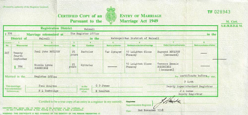 Marriage Certificate : Reference:TF 028943 On 24 September 1994 at Register Office, Walsall, West Midlands Paul John BOULTON : age 25 a Single person of 10, Leighton Close, Pheasey, Birmingham a Car Sprayer married Nicola Lynne BEMBRIDGE age 0025 a Single person of 10, Leighton Close, Pheasey, Birmingham a Car Sprayer in the presence of Gail Denie JONES and Raymond BOULTON : The Husbands Father is Raymond BOULTON : shown as a Deceased : The Wifes Father is Raymond BOULTON is shown as a Deceased