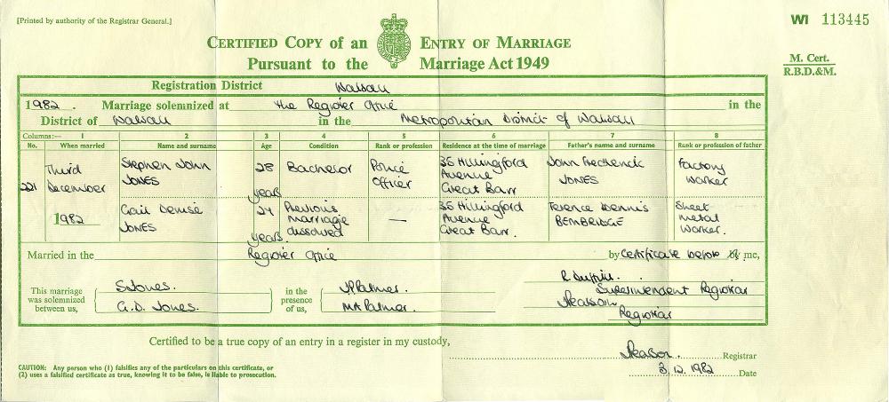 Marriage Certificate : Reference:WI 113445 On 3 December 1982 at Registry Office, Walsall Stephen John JONES : age 28 a Single person of 35, Hillingford Avenue, Great Barr, Birmingham a Police Officer married Gail Denise BEMBRIDGE (JONES) age 0027 a Single person of 35, Hillingford Avenue, Great Barr, Birmingham a Police Officer in the presence of Michael PALMER and Jennie PALMER : The Husbands Father is John Frederick JONES : shown as a Factory Worker : The Wifes Father is John Frederick JONES is shown as a Factory Worker