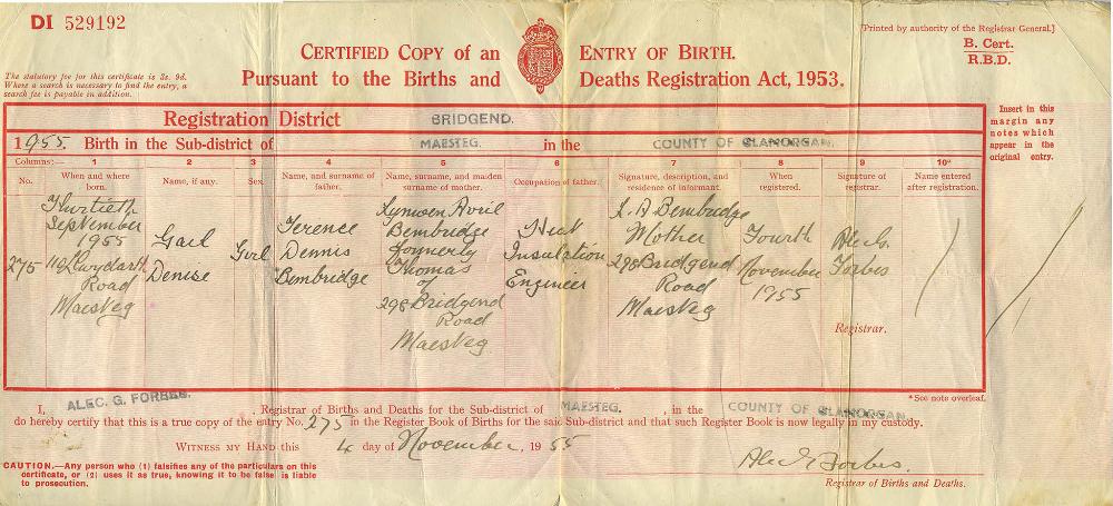Birth Certificate Gail Denise BEMBRIDGE Was Born on 30 September 1955 in 110, Llwydarth Road, Maesteg, Glamorgan, Wales Registered on 4 November 1955 in Bridgend Fathers name is Terence Dennis BEMBRIDGE shown as Heat Insulation Engineer residing at 298, Bridgend Road, Maesteg mother is Lynwen Avril BEMBRIDGE (THOMAS) Registered by Mother Full Certificate number DI529192