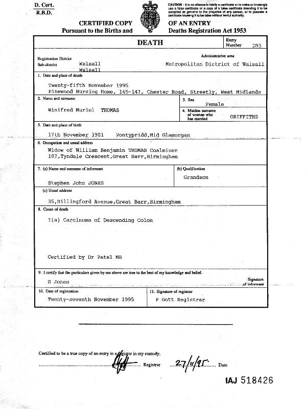 Death Certificate Winifred Muriel GRIFFITHS (THOMAS) 17 November 1901 of 187, Tyndale Crescent, Birmingham Occupation - Widow of coalminer William Benjamin THOMAS. Died on 25 November 1995 at Pinewood Nursing Home, 145-147, Chester Road, Streetly, West Midlands registered by Stephen John JONES Grandson of 187, Tyndale Crescent, Birmingham Cause of death Carcinoma of descending colon Registered at Walsall on 27 November 1995 Reference IAJ518426