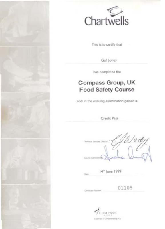 Ibid. awarded credit pass in Food Safety course at Barr Beacon School, Old Hall Lane, Aldridge on 14 June 1999 ; Source - Compass Group, UK Reference Certificate No 01109