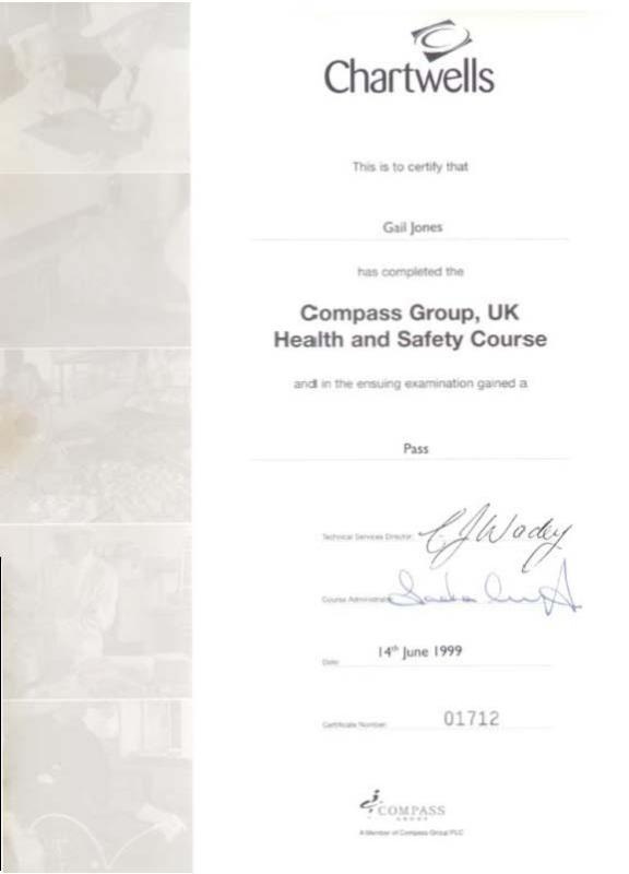 Ibid. awarded certificate for passing Health and Safety Course at Barr Beacon School, Old Hall Lane, Aldridge on 14 June 1999 ; Source - Compass Group, UK Reference Certificate No 01712
