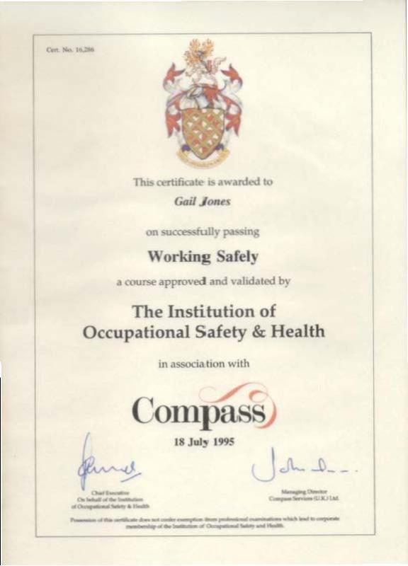 Awards Gail Denise BEMBRIDGE (JONES) (30 September 1955) Awarded certificate for passing Health and Safety Course at Barr Beacon School, Old Hall Lane, Aldridge on 18 July 1995 ; Source - The Institute of Occupational Safety and Health Certificate No 16266