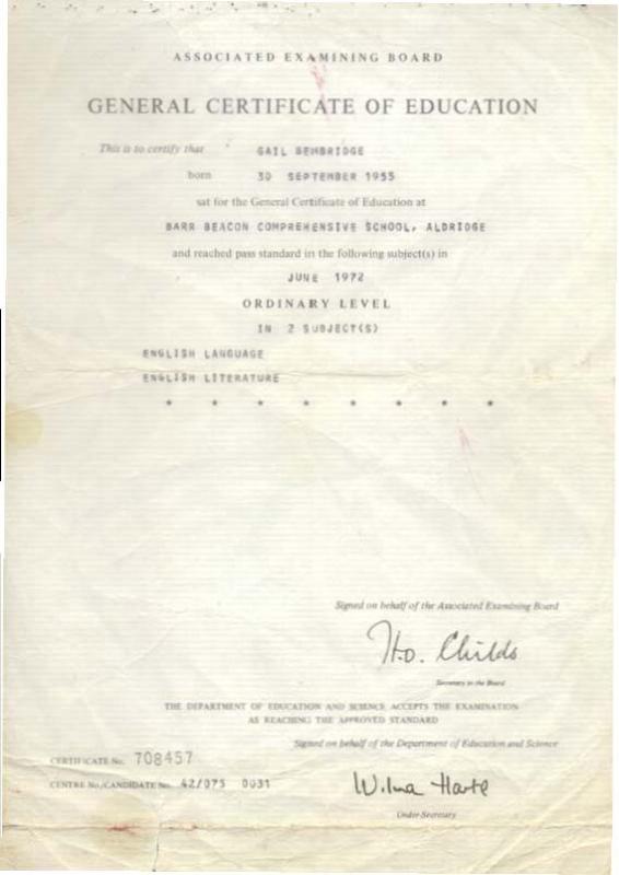 Awards Gail Denise BEMBRIDGE (JONES) (30 September 1955) Awarded 2 O levels at Barr Beacon School, Old Hall Lane, Aldridge, Walsall ; Source - Associated Examining Board Reference Certificate No 708457