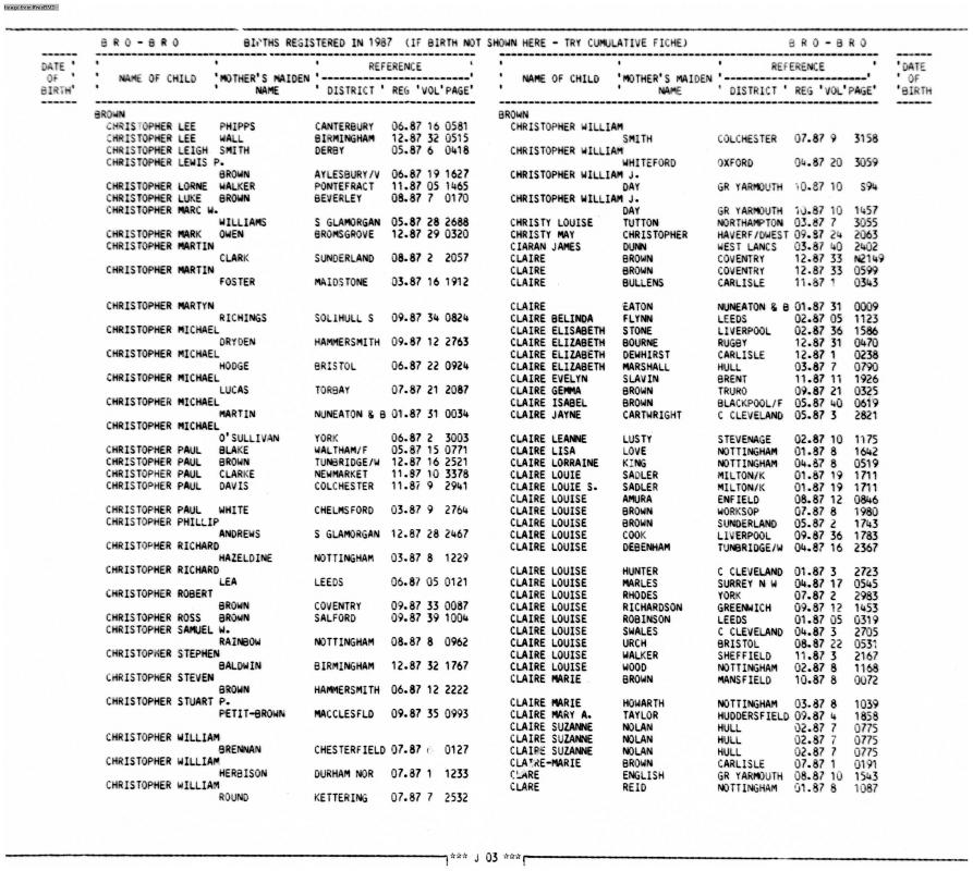 Birth Register Christopher Stephen BROWNRegistered at Birmingham on 21 December 1987 Volume 32 Page 1767 Mothers Maiden Name BALDWIN
