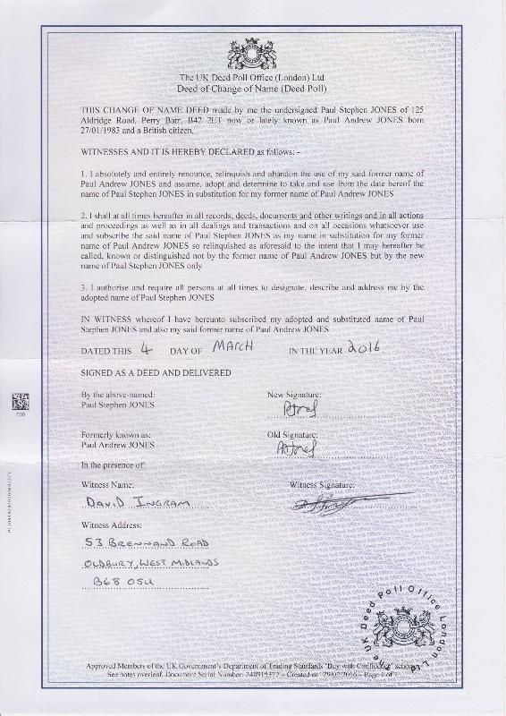 Name Changed By Deed Poll Paul Andrew JONES Born/age 27 January 1983 : Date 4 March 2016 at UK Deed Poll Office, London Ltd Paul Andrew JONES of 127, Aldridge Road, Birmingham changed this name to Paul Stephen JONES Source Paul Andrew (Stephen) JONES