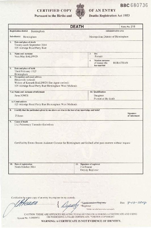 Ibid. Very May ROBATHAN (BALDWIN) 3 February 1923 of 125, Aldridge Road, Perry Barr, Birmingham, West Midlands Occupation - Widow of Kenneth BALDWIN. Died on 29 September 2014 at 125, Aldridge Road, Perry Barr, Birmingham, West Midlands registered by Zena BALDWIN (BROWN) (JONES) Daughter of 125, Aldridge Road, Perry Barr, Birmingham, West Midlands Cause of death Pulmonary Thrombo-Embolism Registered at Birmingham on 9 October 2014 Reference BBC680736