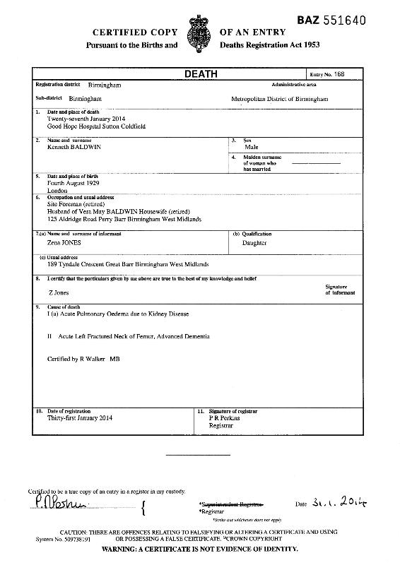 Death Certificate Kenneth BALDWIN 4 August 1929 of 125, Aldridge Road, Birmingham Occupation - Retired Site Foreman. Died on 27 January 2014 at Good Hope Hospital, Sutton Coldfield registered by Zena BROWN (JONES) Daughter of 125, Aldridge Road, Birmingham Cause of death Kidney Disease Registered at Birmingham on 31 January 2014 Reference BAZ551640