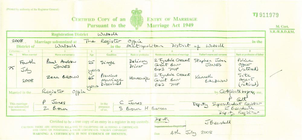 Marriage Certificate : Reference:TJ911979 On 4 July 2008 at Regsiter Office, Hatherton Street, Walsall, West Midlands Paul Andrew (Stephen) JONES : age 27jan1983 a Single person of 2, Tyndale Crescent, Birmingham, West Midlands a Delivery Driver married Zena BALDWIN (BROWN) (LLOYD) age 23 June 1963 a Single person of 2, Tyndale Crescent, Birmingham, West Midlands a Delivery Driver in the presence of Carl JONES and Samantha BROWN and Heather BARNES : The Husbands Father is Stephen John JONES : shown as a Retired Police Officer : The Wifes Father is Stephen John JONES is shown as a Retired Police Officer : Name at birth Anita DOE