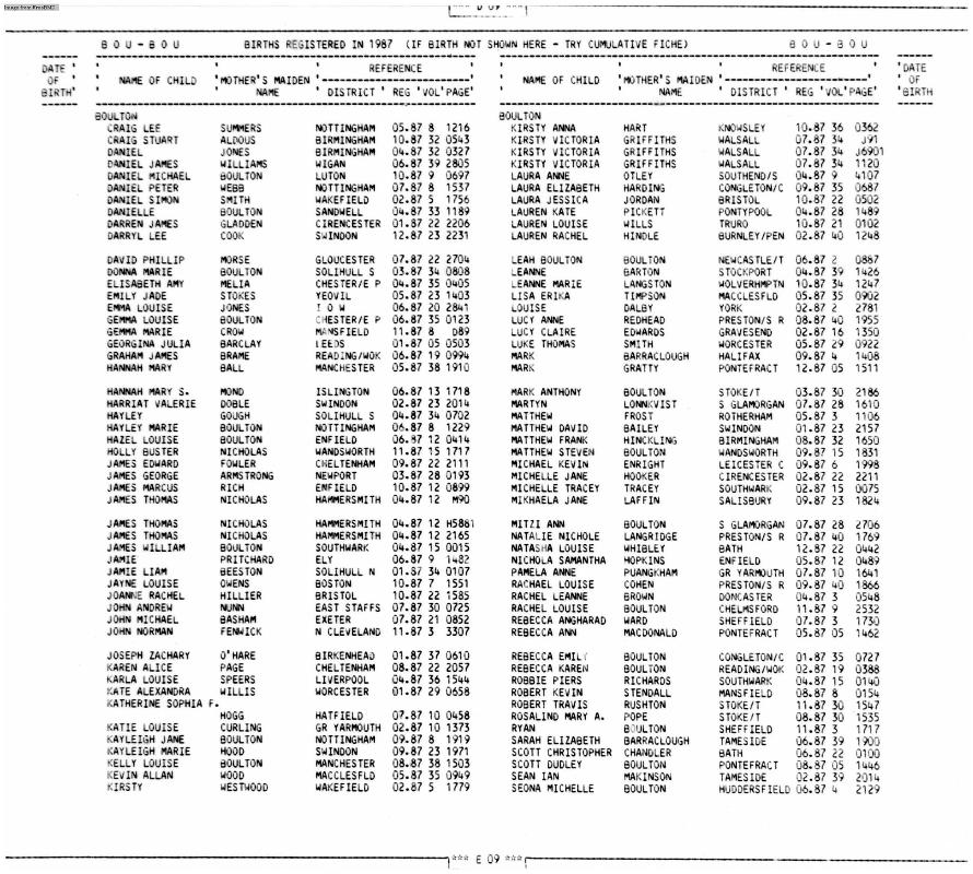 Birth Register Daniel Stephen BOULTONRegistered at Sandwell on 26 December 1986 Volume 33 Page 1189 Mothers Maiden Name BEMBRIDGE