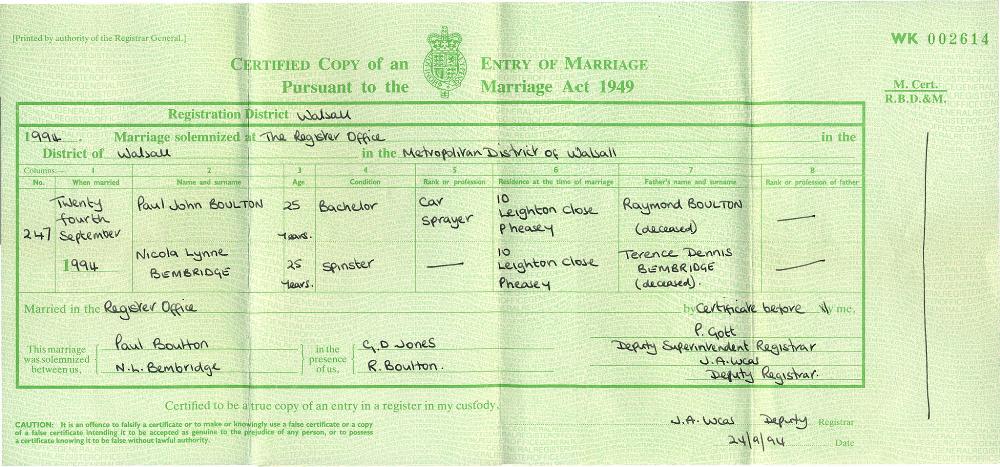 Marriage Certificate : Reference:TF 028943 On 24 September 1994 at Register Office, Walsall, West Midlands Paul John BOULTON : age 25 a Single person of 10, Leighton Close, Pheasey, Birmingham a Car Sprayer married Nicola Lynne BEMBRIDGE age 0025 a Single person of 10, Leighton Close, Pheasey, Birmingham a Car Sprayer in the presence of Gail Denie JONES and Raymond BOULTON : The Husbands Father is Raymond BOULTON : shown as a Deceased : The Wifes Father is Raymond BOULTON is shown as a Deceased