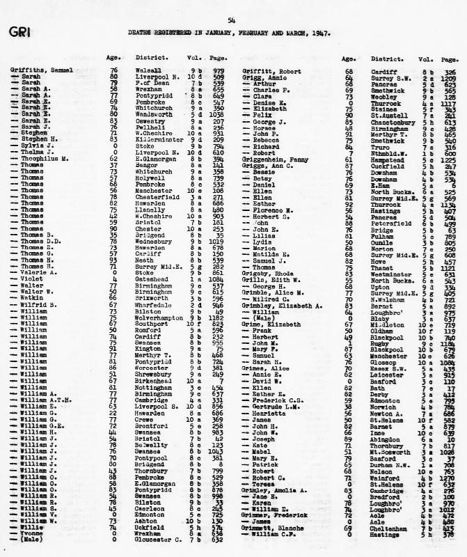 Death Register William J GRIFFITHS Born 1 February 1866 : Died March 1947 Registered at Bridgend Volume 8b Page 8