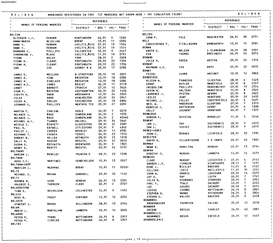 Wedding Register Leslie BEMBRIDGE and Miriam D HUNT : Registered at Hereford During May 1991 : Volume 29 : Page 432 Only 1 image available on BMD Website