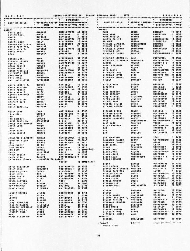 Ibid. Heather Katy BARNESRegistered at Pontypridd on 30 December 1976 Volume 27 Page 1569 Mothers Maiden Name BURNS