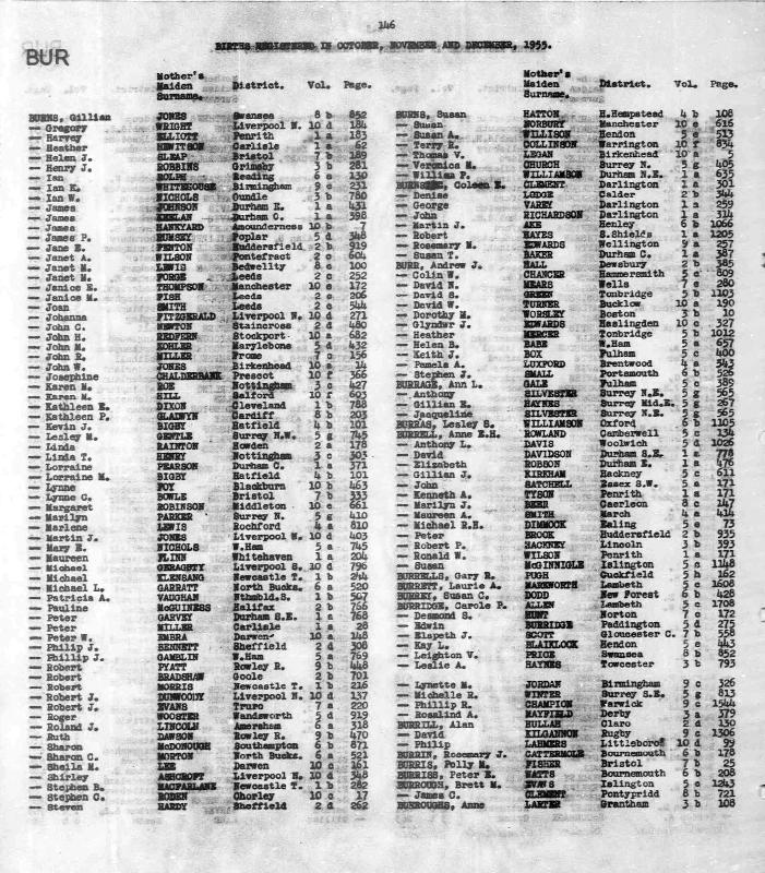 Birth Register Kathleen Paula BURNSRegistered at Cardiff on 4 November 1955 Volume 8b Page 203 Mothers Maiden Name GLADWYN