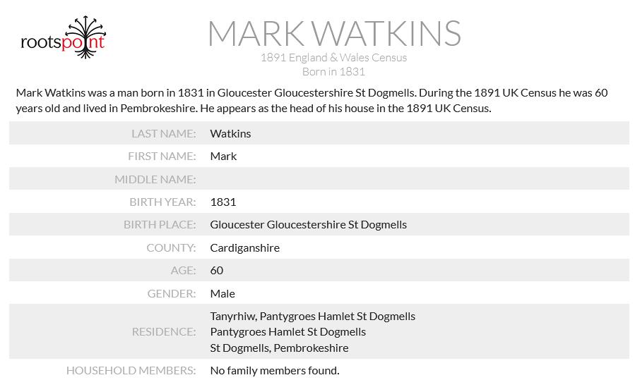 Baptised: William WATKINS Born 1854 of St, Dogwells, Pembrokeshire Was Baptised on 10 August 1854 at St Dogwells, Pembroke Father Mark WATKINS a Labourer Mother Anne Watkins (Stephens) Source: Pembrokeshire, Wales, Anglican Baptisms, Marriages and Burials, 1599-1994 Page 97 Entry no. 772