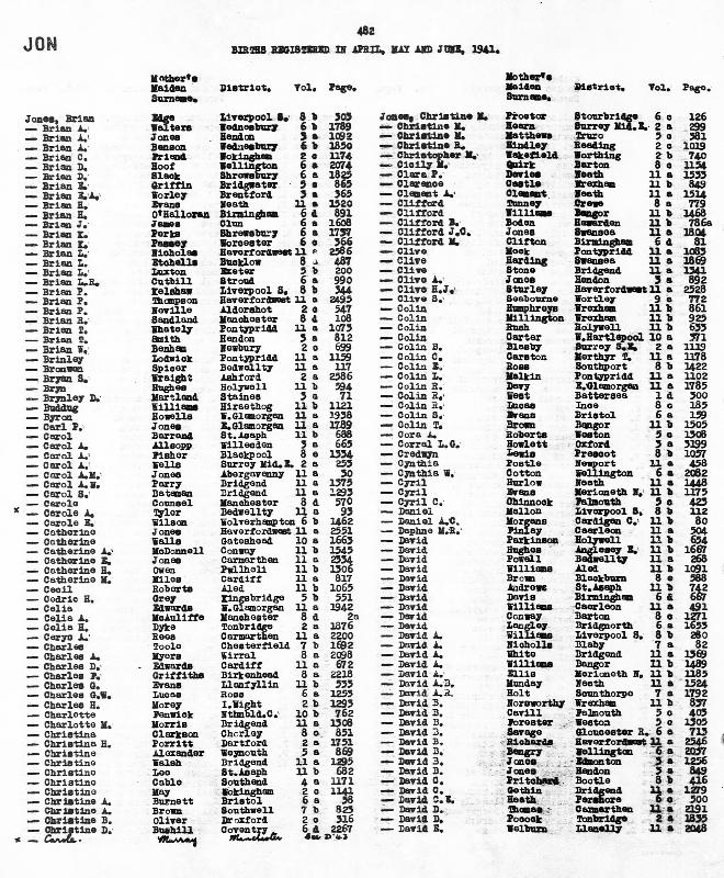 Ibid. Brian A JONESRegistered at Wednesbury on June 1941 Volume 6b Page 1830 Mothers Maiden Name BENSON