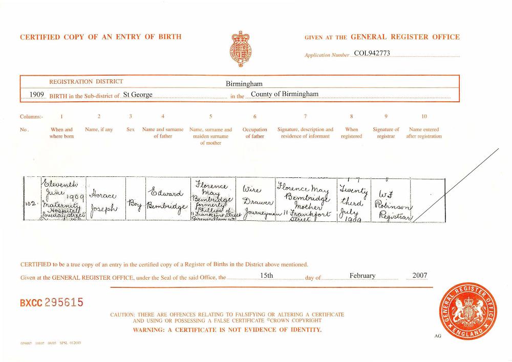 Birth Certificate Horace Joseph BEMBRIDGE Was Born on 11 June 1909 in Maternity Hospital, Loveday Street, Birmingham, Warwickshire Registered on 23 July 1909 in St George, Birmingham Fathers name is Edward BEMBRIDGE shown as Wire Drawer Journeyman residing at 11 Frankfort Street, Birmingham mother is Florence May BEMBRIDGE (PHILLIPS) shown as Mother Full Certificate number BXCC295615