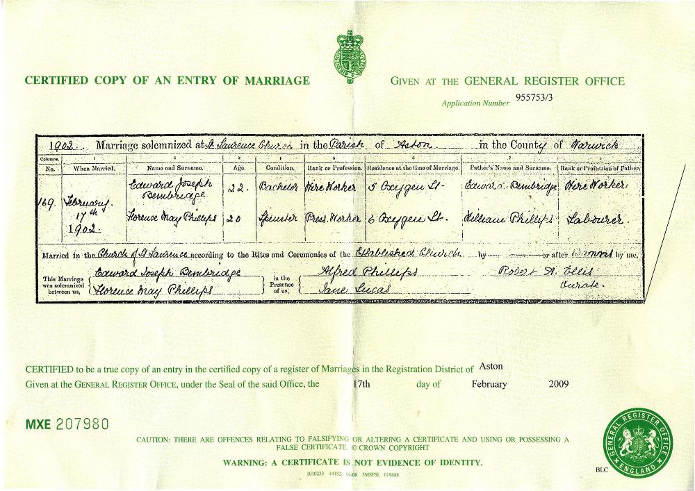 Marriage Certificate : Reference:955753/3 On 17 February 1902 at St Lawrence Church, Aston Edward Joseph BEMBRIDGE : age 22 a Single person of 5, Oxygen Street, Aston, Birmingham a Hire Worker married Florence May PHILLIPS age 0020 a Single person of 5, Oxygen Street, Aston, Birmingham a Hire Worker in the presence of Alfred PHILLIPS and Jane LUCAS : The Husbands Father is Edward BEMBRIDGE : shown as a Hire Worker : The Wifes Father is Edward BEMBRIDGE is shown as a Hire Worker