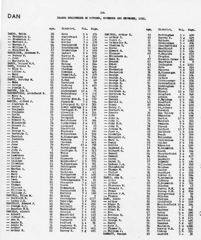 Death Register Catherine Ellen JAMES (DANIELS) Born 1 September 1881 : Died December 1952 Registered at Birmingham Volume 9c Page 204