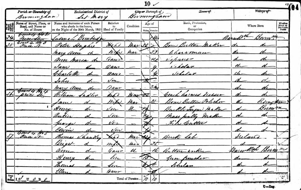 England Census 7 April 1861 : Court 1, 23, Morland Street Birmingham Warwickshire District Birmingham : Sub District St Mary Parish Bishop Ryder Emuneration District 15 Class RG9 Piece 2155 Folio 75 Schedule 222 Page Number 40 40