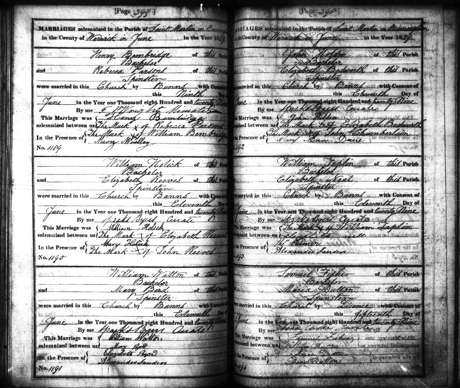 Marriage Certificate Birmingham, England, Church of England Marriages and Banns, 1754: Page 399 Entry 1189 On 9 June 1929 at St Martins, Bull Ring, Birmingham Henry BEMBRIDGE : age 25 a Single person married Rebecca PARSONS age 0022 a Single person in the presence of William BEMBRIDGE and Mary WOOLLEY