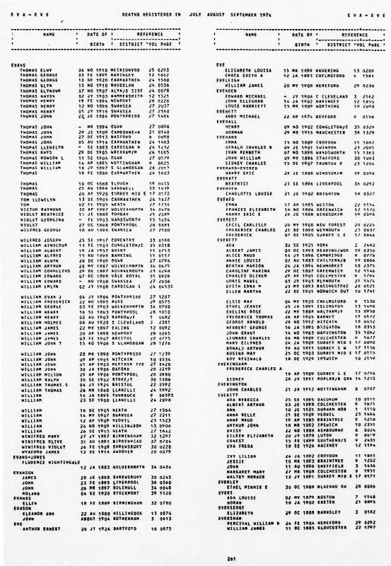 Death Register William Alwyn EVANS Born 20 December 1909 : Died September 1974 Registered at OGWR Volume 27 Page 794