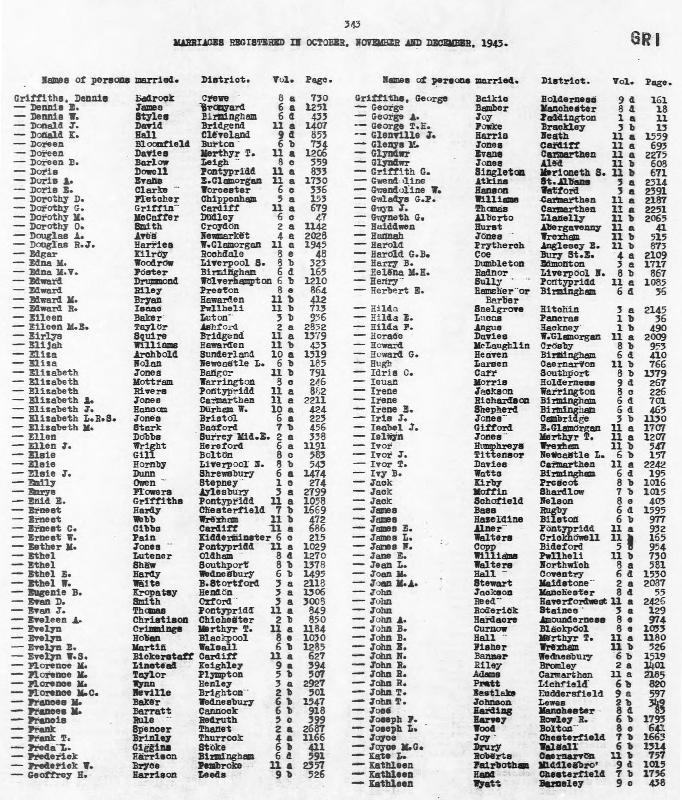 Wedding Register Gwyn Godfrey SQUIRE and Eirlys GRIFFITHS : Registered at Bridgend During December 1943 : Volume 11a : Page 1379