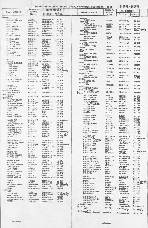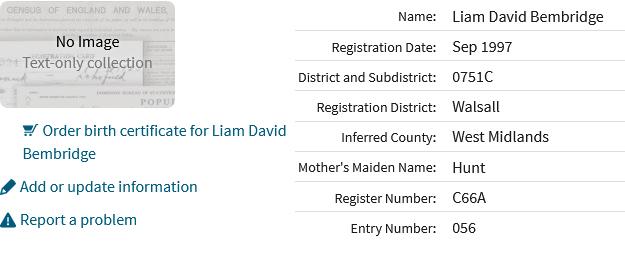 Ibid. Liam David BEMBRIDGERegistered at Walsall on 29 August 1997 Volume C66A Page 056 Mothers Maiden Name HUNT