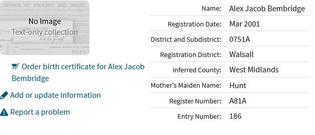 Ibid. Alex Jacob BEMBRIDGERegistered at Walsall on 24 February 2001 Volume A81A Page 186 Mothers Maiden Name HUNT