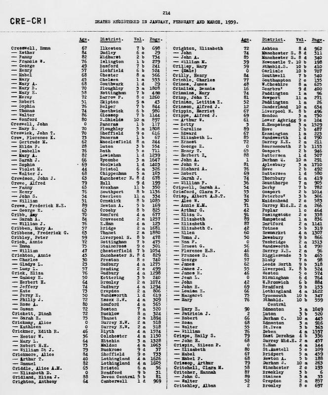 Death Register Lilian Georgina CRESSWELL (TILL) Born 22 July 1900 : Died October 1981 Registered at Sutton, Surrey Volume 15 Page 0421