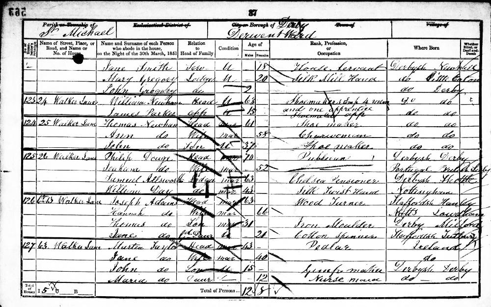 England Census 30 March 1851 : 6/13, Walker Lane Derby Derbyshire District Derwent : Sub District St Alkmund Parish Derby St Michael Class HO107 Piece 2142 Folio 563 Schedule 126 Page Number 37 GSU Roll 87772 37