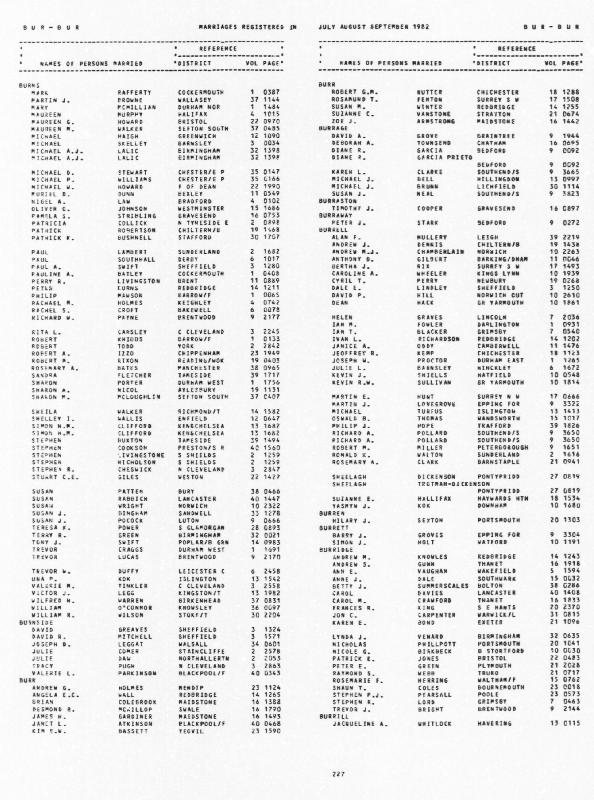 Wedding Register Michael J BURRAGE and Susan BRUNN : Registered at Lichfield During September 1982 : Volume 30 : Page 1114