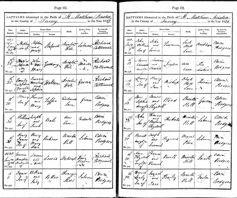 Baptised: William BALE Born 1827 of Acre Lane, Lambeth, Surrey Was Baptised on 30 December 1827 at St Mathew-Lambeth, Surrey Father Joseph BALE a Carpenter Mother Sarah BALE (McKellow) Source: London, England, Church of England Births and Baptisms, 1813-1917 Page 62 Entry no. 493