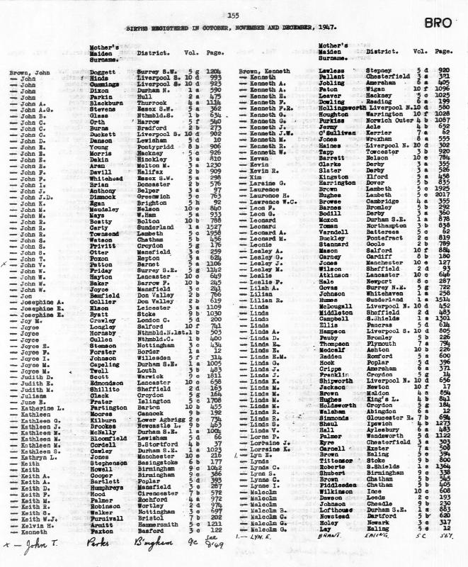 Birth Register Keith William BROWNRegistered at Birmingham on December 1947 Volume 9c Page 1042 Mothers Maiden Name HOWELL