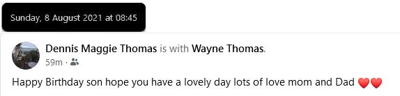 Birth Register Wayne Dennis THOMASRegistered at Walsall on 8 August 1973 Volume 9b Page 2158 Mothers Maiden Name DAVIS