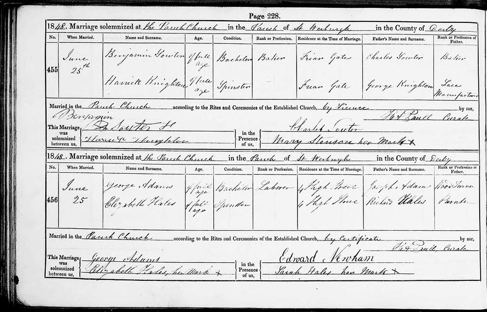 Marriage Certificate Derbyshire, England, Church of England Marriages and Banns, 1754-1932: Page 228 Entry 456 On 25 June 1848 at Saint Werburgh, Derby George ADAMS : age 25 a Single person of 4, High Street, Werburgh, Derbyshire a Labourer married Elizabeth HALES age 0021 a Single person of 4, High Street, Werburgh, Derbyshire a Labourer in the presence of Edward NEWHAM and Sarah HALES : The Husbands Father is Joseph ADAMS : shown as a Wood Turner : The Wifes Father is Joseph ADAMS is shown as a Wood Turner