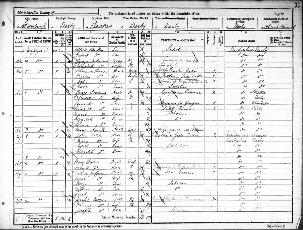 England Census 5 April 1891 : 4, High Street, Saint Werburgh Derby Derbyshire District Derby : Sub District Derby Parish Christchurch Emuneration District 38 Class RG12 Piece 2732 Folio 36 Page Number 25 GSU Roll 6097842 25