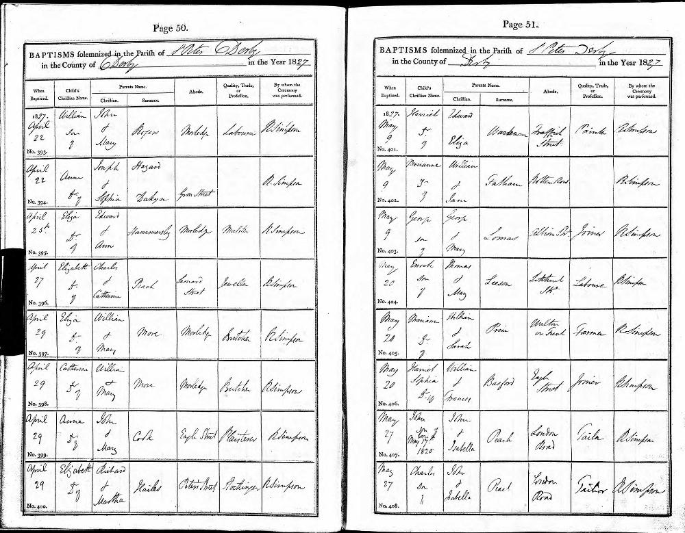 Baptised: Elizabeth HALES Was Baptised on 29 April 1827 at St Peter, Derby, Derbyshire Father Richard HALES a Packer Mother Martha HALES Source: Derbyshire, England, Church of England Births and Baptisms, 1813-1916 Page 50 Entry no. 400