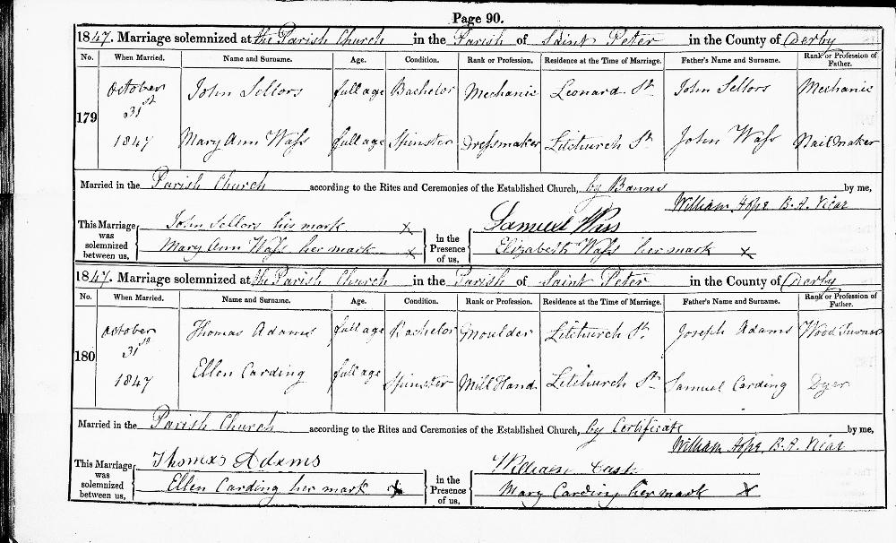 Marriage Certificate Derbyshire, England, Church of England Marriages and Banns, 1754-1932: Page 90 Entry 180 On 31 October 1847 at The Parish Church of St Peter, Derby Thomas ADAMS : age 27 a Single person of Litchurch Street, Derby a Moulder married Ellen CARDING age 0027 a Single person of Litchurch Street, Derby a Moulder in the presence of William CASH and Mary CARDING : The Husbands Father is Joseph ADAMS : shown as a Wood Turner : The Wifes Father is Joseph ADAMS is shown as a Wood Turner