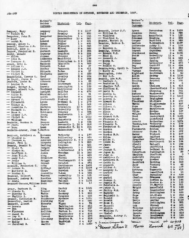 Birth Register Edwin DENNANTRegistered at Walsall on 21 November 1927 Volume 6b Page 32 Mothers Maiden Name HAMBRIDGE