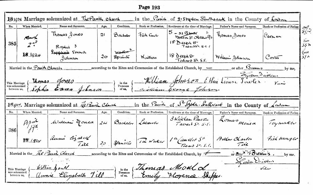 Marriage Certificate : Page 193 Entry 386 On 5 April 1924 at St Stephen Church, Southwark William James MOULD : age 24 a Single person of 3, Wickham Place Tabard Street, Southwark a Labourer married Annie Elizabeth TILL age 0020 a Single person of 3, Wickham Place Tabard Street, Southwark a Labourer in the presence of Thomas MOULD and Emily Florence SKIPPER : The Husbands Father is Thomas MOULD : shown as a Toy Maker : The Wifes Father is Thomas MOULD is shown as a Toy Maker
