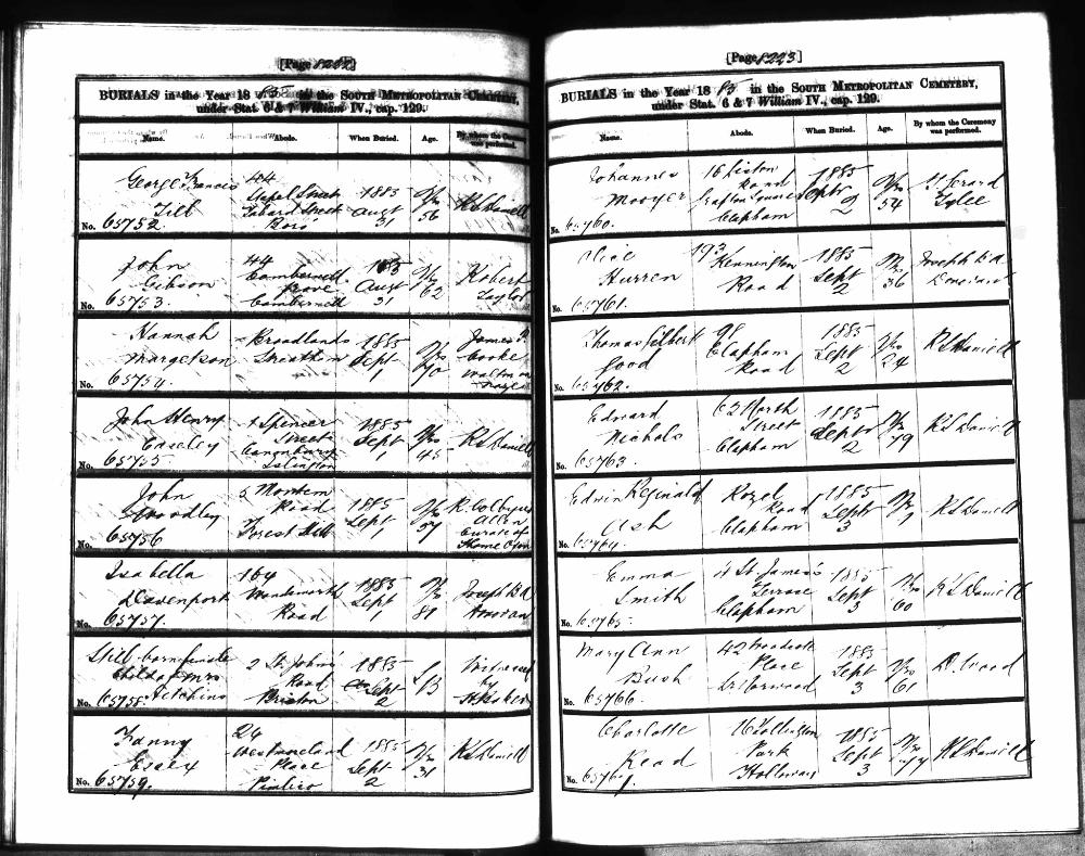 Burials George Francis TILL Born 1831 Buried 31 August 1885 at South Metropitan Cemetry, Norwood Street, Lambeth Source: London Metropolitan Archives; London, England Reference(s) DW/T/0943 Comments Page 8222 Entry 65752