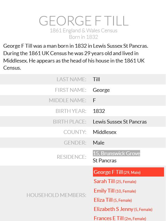 England Census 7 April 1861 : 15, Brunswick Grove St Pancras Middlesex Class RG9 Piece 105 Folio 46 Page Number 4 GSU Roll 542574 4