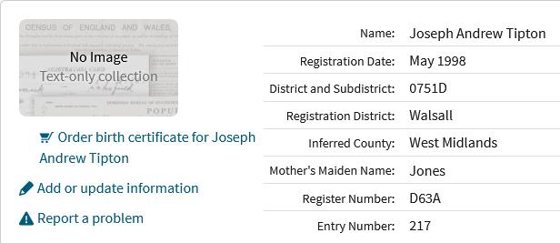 Birth Register Joseph Andrew TIPTONRegistered at Walsall on 10 May 1998 Volume D63A Page 217 Mothers Maiden Name JONES