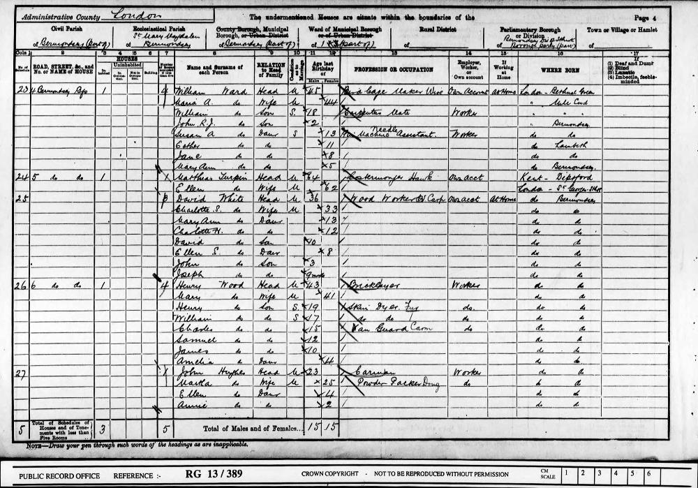 England Census 13 March 1901 : 4, Bermondsey Buildings Southwark Surrey District St Olave, Southwark : Sub District Bermondsey Parish St Mary Magdelene Emuneration District 11 Piece 389 Folio 60 Schedule 23 Page Number 4 4