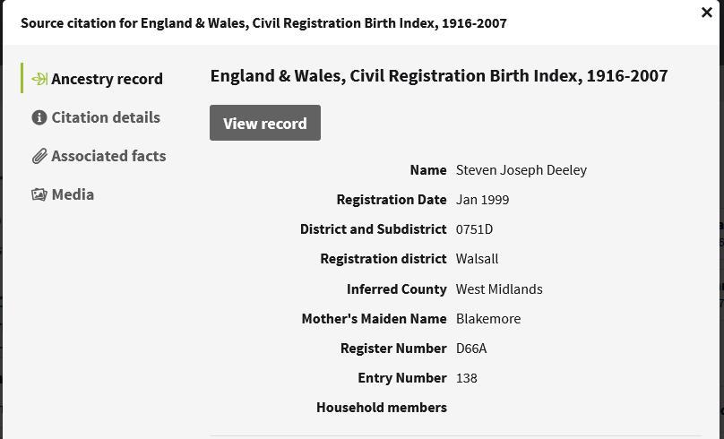 Birth Register Steven Joseph DEELEYRegistered at Walsall on 7 January 1999 Volume 1d Page 075 Mothers Maiden Name BLAKEMORE Comments Register Number D66A: Entry No.: 138