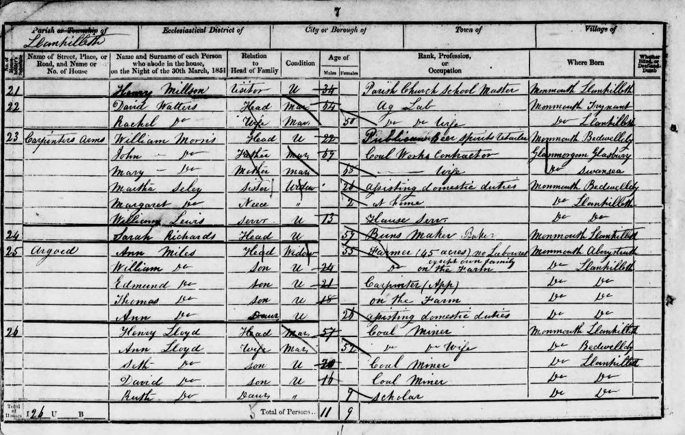 Wales Census 30 March 1851 : 26 Argoed Llanhilleth Monmouthshire District Pontypool : Sub District Pontypool Emuneration District 1A Class HO107 Piece 2449 Folio 7 Schedule 26 Page Number 7 GSU Roll 104188-104189 7